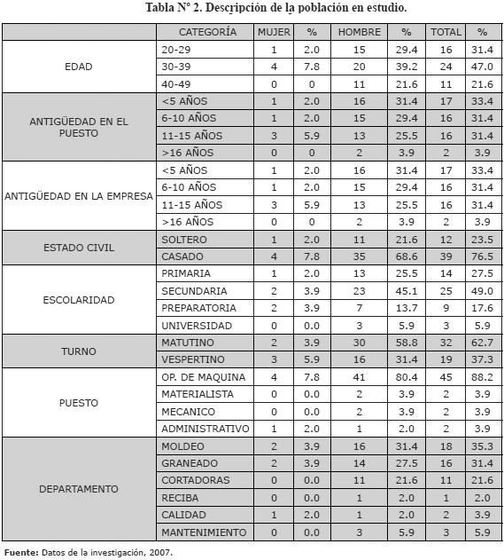 La población estuvo distribuida en masculina con el 90% y femenina con el 10%. En cuanto al estado civil, la categoría casado equivale al 76% y soltero el 24%. El puesto de trabajo que más accidentes tuvo, fue el operador de máquina con el 88%, mientras que los puestos de materialista, mecánico y administrativo cuentan con el 4% cada uno. La escolaridad predominante fue la secundaria con el 49%, al nivel primaria corresponde el 27%, la preparatoria con el 18% y el nivel superior con el 6%. La mayoría de los accidentes ocurrieron en el primer turno con el 63%, en tanto que el segundo turno tuvo 37%. En relación con el departamento que más accidentes tuvo fue moldeo de metal con 35%, contra un 31% de graneado, 22% de cortadoras, 6% de mantenimiento, 4% de calidad y el 2% de reciba (Ver Tabla Nº 2).