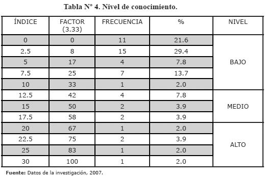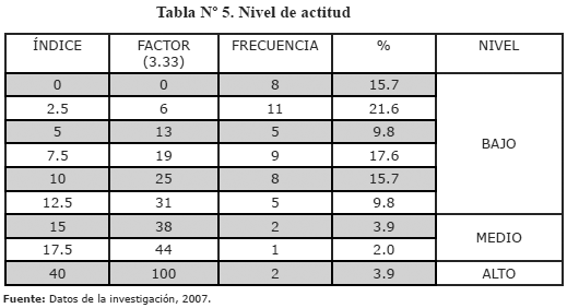 Sin embargo, al analizar las variables "conocimiento y actitud" de manera independiente, fue posible identificar el nivel con el que cuentan los trabajadores respecto a la prevención de riesgos laborales. El índice calculado para la variable "conocimiento", resultó en un rango mínimo de 0, en tanto que el máximo fue de 30. Dichos valores fueron ponderados con un factor de 3,33, para alcanzar un máximo de 100, en el caso de la variable conocimiento y para la variable "actitud", con un índice del rango mínimo de 0 y un máximo de 40 y cuyos valores fueron ponderados con un factor de valor de 2,5. Ver Tablas Nº 4 y 5.