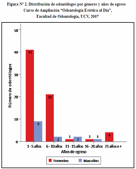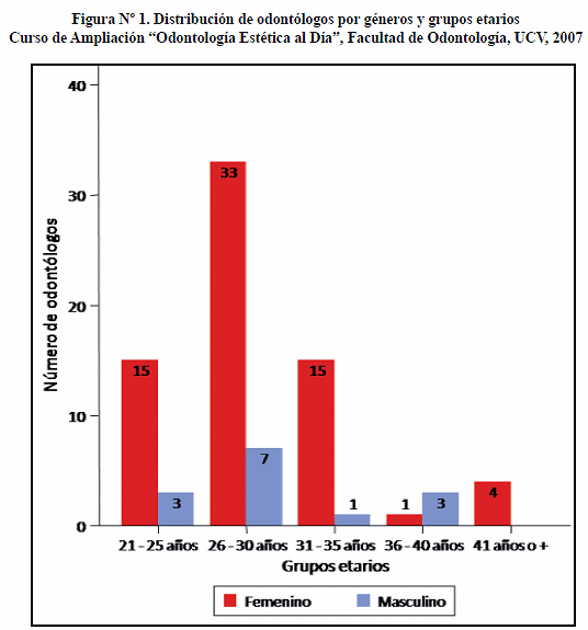 De los 82 odontólogos participantes en el curso de ampliación, 68 eran del sexo femenino (82,93%) y sólo 14 del sexo masculino (17,07%), para una proporción de 4,9:1. De ellos, 48 mujeres (70,59%) y 10 hombres (71,43%) tenían entre 21 y 30 años de edad al momento de la recolección de datos (Figura N° 1), 41 mujeres (60,29%) y 9 hombres (64,29%) habían obtenido su título de Odontólogo en los últimos 5 años (Figura N° 2), y 46 mujeres (67,65%) y 10 hombres (71,43%) tenían entre 1 y 5 años de práctica clínica profesional (Figura N° 3).
