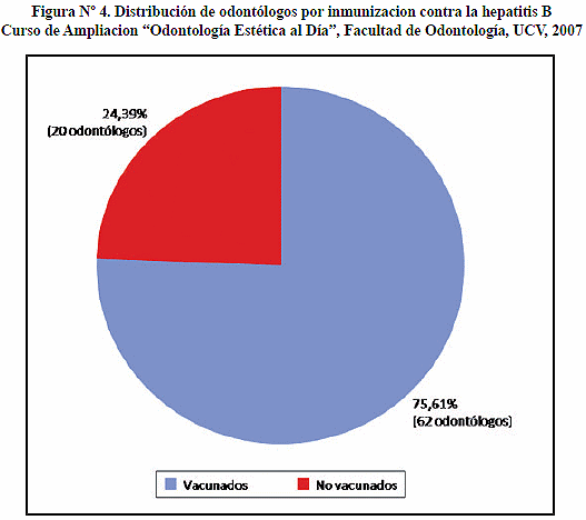 Del total de participantes, 75,61% aseguró estar vacunado contra la hepatitis B (Figura N° 4), dato importante a ser tomado en consideración en el análisis, dado que de los profesionales de la salud el odontólogo es uno de los más expuestos a accidente laboral por la naturaleza de su trabajo, como pudieron corroborar los autores de la presente investigación en otro estudio (Tovar, Cardozo & Guerra, 2009) donde se puso de manifiesto la alta prevalencia de accidentes laborales