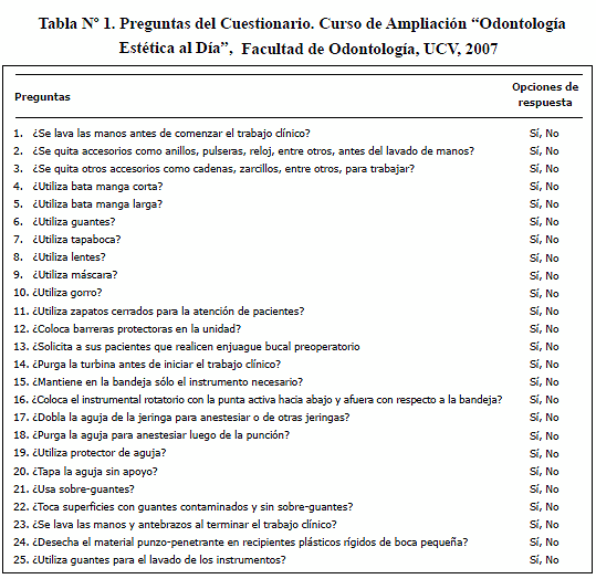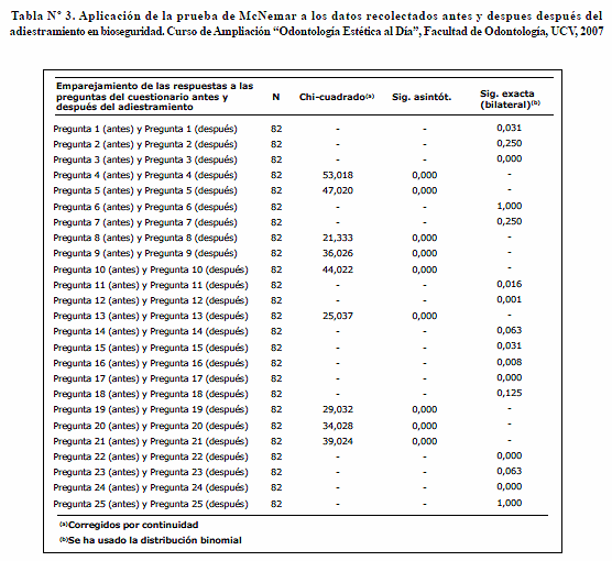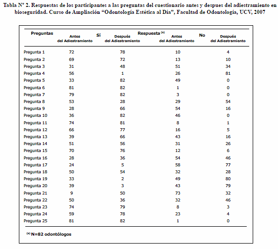 en la práctica clínica odontológica venezolana.En la Tabla N° 2 se observan las distribuciones de frecuencia de las respuestas de los odontólogos participantes del estudio (N = 82) a las 25 preguntas del cuestionario (Tabla N° 1) antes y después del adiestramiento en bioseguridad antes mencionado, existiendo cambios en los patrones de respuestas en todas las preguntas. Sin embargo, de acuerdo a la Prueba de McNemar (Tabla N° 3) estas diferencias en los patrones de respuesta después del adiestramiento con respecto a los datos recolectados antes de éste fueron estadísticamente significativas en 18 preguntas, siendo mayor en las preguntas 4, 5 y 10, dado el valor de la χ2 en cada una de ellas. En las dos primeras, referidas al uso de bata manga corta y manga larga, respectivamente, se evidenció predilección en el uso de la segunda posterior al adiestramiento. En el caso de la pregunta 10, todos los participantes que habían manifestado no utilizar gorro en la recolección inicial de datos, demostraron con su respuesta a la misma pregunta en la recolección final que adquirieron el hábito de usarlo, mientras que aquellos que afirmaron utilizarlo antes del adiestramiento, mantuvieron este hábito posterior al mismo.