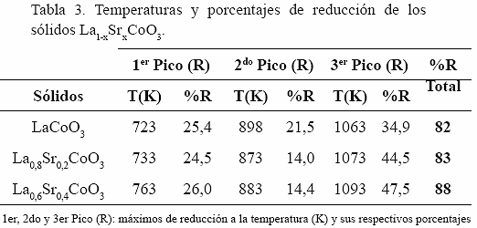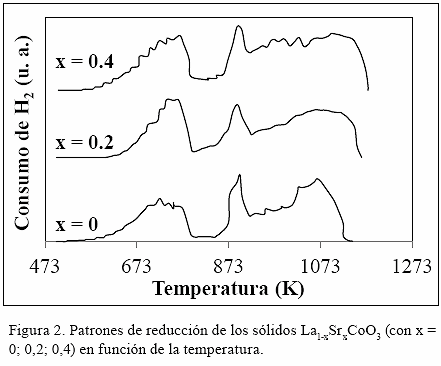 Los perfiles de reducción de los sólidos La1-xSrxCoO3 (Fig. 2) muestran tres máximos de consumo de hidrógeno (Tabla 3), infiriendo que la reducción ocurre a través de fases intermediarias, como ha sido demostrado en los análisis de DRX in situ sobre el sólido LaCoO3 (Martínez et al. 2001). Cuyos resultados indican que a 723 K se forma la fase La4Co3O10, (primer pico de reducción), a 873 K se forma el óxido tipo espinela La2CoO4 (segundo pico de reducción) y a 973 K ocurre la reducción total del sólido formando las fases La2O3 y Co0 (tercer máximo de reducción, Fig. 2).