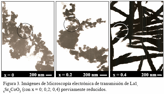Las micrografías de MET combinados con los análisis de EDX de los sólidos La1-xSrxCoO3 previamente reducidos (Fig. 3), permiten visualizar claramente la localización de la fase metálica de cobalto (Co0) identificadas en un círculo con un diámetro promedio de partículas entre 10-15 nanómetros similares a los obtenidos mediante la ecuación de Scherrer 22-23 nm (Klug y Alexander 1974) (Tabla 2). Dichas partículas se encuentran altamente dispersas en la matriz del sólido conformada por las fases La2O3 y SrO que son los productos del proceso de reducción (Tabla 1) (Valderrama et al. 2010). Los resultados de MET-EDX (Fig. 3), corroboran una de las ventajas del uso de sólidos tipo perovskita como precursores catalíticos, ya que su reducción produce las fases metálicas altamente dispersas.