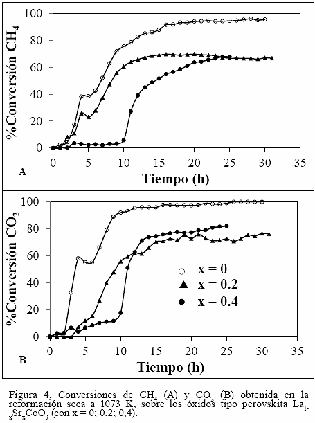 La Figura 4 muestra que el sólido LaCoO3 sin dopaje presenta mayor actividad durante la reformación seca de metano a 1073 K, con conversiones de equilibrio de CH4 y CO2 de 93,6 y 98,9% respectivamente, las cuales se mantienen constante por ~ 30 h. Por otra parte, el incremento de Sr (x) disminuye la conversión y retarda la reacción en estudio, requiriendo mayores tiempos para la activación del sólido; por ejemplo para x = 0,4 se necesita ~ 10 h de reacción (Fig. 4A), debido a que los sólidos dopados con Sr necesitan temperaturas de reducción ligeramente superiores para formar la especie activa (Co0) en comparación con el sólido sin dopar, como se observó durante el proceso de reducción de estos sólidos (Fig. 2, Tabla 3).