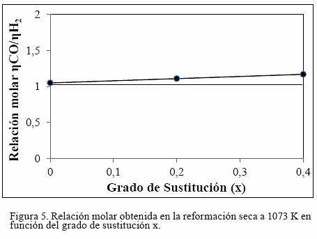 Por último, se observa que las relaciones molares hO / hH2 incrementan ligeramente con el grado de sustitución x (Fig. 5), infiriendo que el H2 producido durante la reformación seca de metano (ec. 1) reacciona con el CO2 presente en la mezcla reactiva (inversa ec. 2), la cual se traduce en un incremento ligero de las conversiones de CO2 (Fig. 4B) y de las selectividades de CO por consiguiente incrementa la relación molar hO / hH2. Dado que, los valores de la relación molar hO / hH2 están muy cercanos a 1 (Fig. 5) suponemos que la reacción que ocurre preferiblemente sobre estos sólidos es la reformación seca de metano (ec. 1).