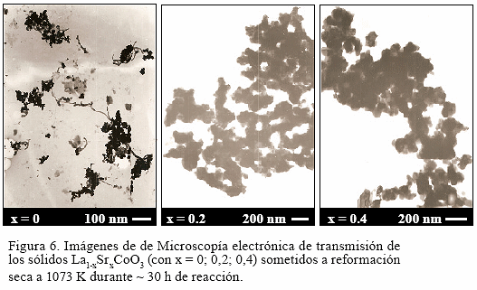 En las micrografías de MET llevadas a cabo sobre los sólidos experimentados en el test catalítico puede apreciarse, después de una exhaustiva búsqueda, la formación de pocos nanotubos de carbón (Fig. 6) aún con las severas condiciones de reacción utilizadas (T = 1073 K y tiempo ~ 30 h). De acuerdo, a los análisis de EDX los nanotubos de carbón están constituidos de partículas muy pequeñas que corresponden a Co metálico (Fig. 6). Considerando que la presencia de Sr ejerce un efecto dopante de electrones que estabiliza aún más las partículas de Co0, aunado a la alta dispersión metálica y a la presencia de las fases La2O2CO3-SrO; todas estas bondades desfavorecen la formación de carbón e incrementa la actividad de los catalizadores.