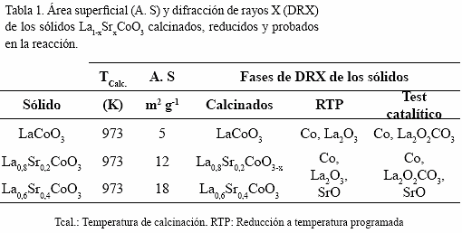 Luego que culmina el test catalítico, los sólidos fueron examinados por DRX, revelando la presencia de las fases Co metálico, La2O2CO3 y SrO (Tabla 1), estas fases explican las altas actividades obtenidas durante el curso de la reacción. Cabe destacar que la fase SrCO3 no se detectó por DRX a pesar que se obtuvo bajo atmosfera de CO2 (Valderrama et al. 2005), quizás no se detectó porque dicha fase se formó con un tamaño de partícula por debajo del límite de detección de los rayos X o como un intermediario de reacción que contribuye a la formación de La2O2CO3 y regeneración de SrO (Valderrama et al. 2010), mediante las reacciones: