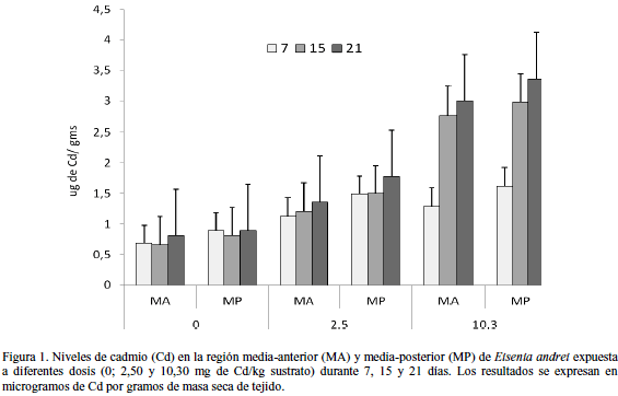 La determinación del contenido de Cd en las regiones MA y MP de las lombrices controles y expuestas fue realizado por espectrofotometría de absorción atómica según Rojas de Astudillo et al. (2002). Los tejidos fueron deshidratados a 60°C durante 3 días o hasta alcanzar un peso constante. Se procedió a realizar una pre-digestión por 24 horas con 5 mL de ácido nítrico al 69% a temperatura ambiente. Seguidamente las muestras fueron digeridas a 60°C por 4 horas, y luego a 80°C por 2 horas. Posteriormente, se filtraron sobre papel Whatman N° 42, completándose a un volumen final a 10 mL con agua desionizada. La absorbancia específica del Cd en las muestras fue cuantificada en un espectrofotómetro Perkin-Elmer modelo 403. La validación del método se realizó con material de referencia certificado CRM de hepatopáncreas de langosta (TORT-2) de la Nacional Research Council of Canadá (Nova Scotia, Canadá), obteniéndose un porcentaje de recuperación del metal del 95-98%.