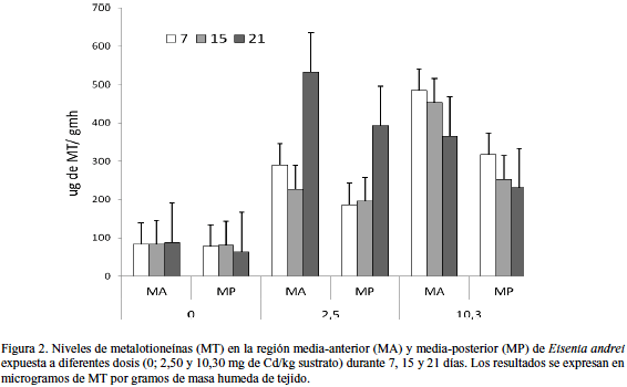 Los niveles de MT fueron elevados en ambas regiones corporales de organismos expuestos al Cd con respecto a sus controles, en asociación a las concentraciones de exposición usadas (Fs = 105,06; p < 0,001). No obstante, a 21 días se observó ligero descenso en las concentraciones de MT en los organismos expuestos a la más alta concentración (Fig. 2). Los niveles de MT encontrados en la MA fueron mayores en comparación con la MP (Fs = 1,45; p < 0,001).