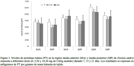 Las concentraciones de proteínas totales (PT) en ambas porciones corporales de las lombrices experimentales mostraron diferencias significativas por efecto de las diferentes concentraciones (Fs = 108,03; p < 0,001) y períodos de exposición (Fs = 3,63; p < 0,05); incluyendo interacción entre ambos factores (Fs = 3,27; p < 0,05) (Fig. 3). La relación entre las concentraciones de PT y Cd acumulado en esta región fue determinada mediante la relación PT = 5,67 Cd + 37,70; registrando un coeficiente de correlación de 0,563 (r2 = 31,70%), indicando una relación moderadamente fuerte entre las variables. Las mayores concentraciones de PT entre las regiones estudiadas fueron encontradas en la región MA de organismos expuestos (Fs = 69,9; p < 0,001).