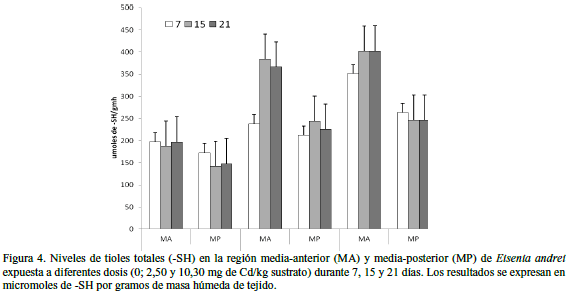 Las concentraciones de proteínas totales (PT) y tioles totales (-SH) en la región MA pone en evidencia los ajustes bioquímicos en la defensa contra la toxicidad causada por Cd o la reducción de posibles daños oxidativos en la porción clitelar. Algunos autores han demostrado que las MT y otras proteínas similares ricas en SH pueden desempeñar un rol protector contra el estrés oxidativo en organismos expuestos a compuestos pro-oxidantes (Viarengo et al. 2000, Zapata-Vívenes y Nusetti 2007). Según Stürzenbaum et al. (2004), E. andrei sintetiza tres clases de proteínas de alto peso molecular (CdBP) con afinidad por Cd. Tales CdBP han sido ampliamente reportadas en diferentes especies de lombrices de tierras: Lumbriculus variegatus (Bauer-Hilty et al. 1989), Dendrobae narubidus (Morgan et al. 1989), Tubifex tubifex (Gillis et al. 2004) y Eisenia foetida (Suzuki et al. 1980, Stürzenbaum et al. 1998).