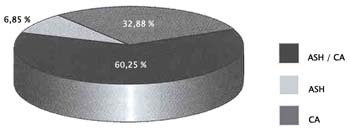 La efectividad de los medios de cultivo utilizados (ASH y CA) para el aislamiento de G. vaginalis puede apreciarse en el gráfico 2. De 73 cultivos positivos, 44 cepas (60,27%) se recuperaron a partir de ambos medios de cultivo, 24 (32,88%) crecieron únicamente en CA, y 5 (6,85%) sólo en ASH.