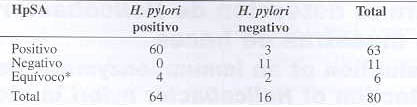 Cuadro 1. Comparación de la prueba HpSA con los métodos diagnósticosdel criterio de positividad.