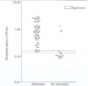 Se realizó lectura visual y espectrofotométrica a 450 nm. El punto de corte usado fue: <0,140 negativo; 0,140 a 0,159 equívoco y >0,160 positivo. De acuerdo a las recomendaciones del fabricante, los casos equívocos deben ser repetidos, y si persiste el resultado se debe obtener otra muestra. En este estudio los muestras equívocas no se repitieron, de manera que esos pacientes fueron excluidos para el cálculo de sensibilidad y especificidad.