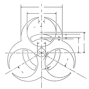 Dicho logotipo debe ser reproducido en color naranja-fluorescente o rojo-anaranjado; en cuanto al fondo, no se exige un determinado color, sino una tonalidad que permita ver claramente el contraste, aunque se prefiere el blanco. Adicionalmente debe incluirse una inscripción acompañando el citado símbolo, donde se indique: la naturaleza o identidad del riesgo, nombre de la persona responsable de su control, información referente a precauciones, etc. Debe mencionarse que todos estos datos se colocarán debajo de la figura, y nunca superpuestos a ella. En la figura Nº 3 se indican las proporciones que se deben respetar en el diseño del símbolo de riesgo biológico.