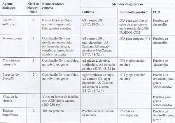 Tabla. Esquema propuesto por los INH-CDC para el diagnóstico de laboratorio de los potenciales agentes involucrados en actos de bioterrorismo