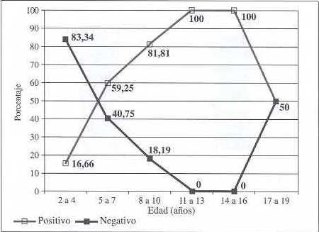 Se evidencia en las edades comprendidas entre 2 y 4 años una frecuencia de infección de 16,66%; de 5 a 7 años del 59,25%; y de 11 a 16 años del 100% (ver gráfico 2)