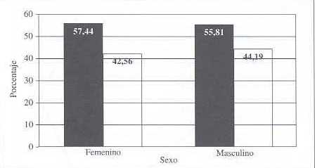 Del total de pacientes del sexo femenino, el 57,44% resultó positivo para IgG anti-Helicobacter pylori, y del sexo masculino el 55,81% (ver gráfico 3)