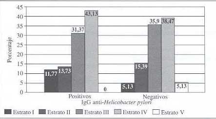 Del total de pacientes con IgG anti-Helicobacter pylori positiva, el 43,13% pertenece al estrato socioeconómico IV y el 31,37% pertenece al III. En los pacientes negativos, el 38,47% pertenece al estrato IV y el 35,90% al III (ver gráfico 4)