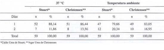 Al evaluar el tiempo transcurrido en el cual se hace evidente la hidrólisis de la urea, se observó que el cambio de color de amarillo a rosado intenso en ambos medios de cultivo, fue apreciado entre las 24 y 48 horas de observación, con un fuerte predominio a las 24 horas, especialmente en las pruebas cuyos medios fueron conservados en estufa a 37 °C. No se observó cambio del color del medio después del segundo día (tabla 3).