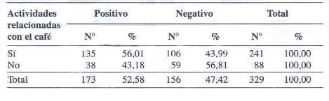 El 56 % de los individuos que realizaban actividades relacionadas con el cultivo del café o tenían antecedentes de las mismas tuvo una reacción positiva a la prueba, mientras que el 43% de los sujetos que no tenían relación con la caficultura tuvo una reacción positiva a la prueba intradérmica (cuadro 1).