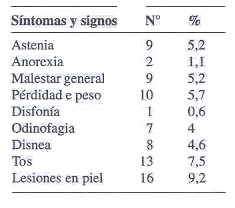 El 9,2 % de los individuos reactores positivos presentó lesiones en piel, seguidos de un 7% que refería tos y un 5,7 % que refería perdida de peso (cuadro 2).