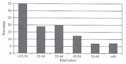 El 35% de los individuos reactores positivos, es decir, con paracoccidioidomicosis infección, tenía edades comprendidas entre 12 y 24 años, seguido de un 19% con edades comprendidas entre 35 y 44% (gráfico 3).
