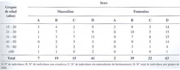 El cuadro 2 muestra la distribución en grupos de edad, observados entre los individuos muestreados. Numéricamente el sexo femenino resultó ser mayor. Al aplicar la encuesta epidemiológica para presencia/ausencia de leishmaniasis, fue el sexo masculino el que presentó mayor número de lesiones activas, mientras que el grupo femenino presentó mayor número de cicatrices. No se observaron diferencias en el grupo sin antecedentes leishmánicos, en cuanto al sexo. Cada grupo fue separado según la edad de sus integrantes, observándose el grupo etario de 31 a 40 años como el predominante en sexo masculino y mayor uniformidad muestral en los distintos grupos del sexo femenino.