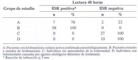Cuadro 3. Respusta antigénica leída a las 48 horas en diversos grupos humanos de una zona endémica para leishmaniasis cuténea.