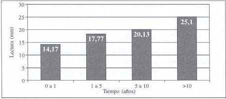 De 64 individuos (de uno y otro sexo) estudiados en este ensayo, 55 mostraron cicatrices y 9 presentaron lesión activa de leishmaniasis. La aplicación de la intradermorreacción arrojó un porcentaje de positividad de 92,19% en la población. Se observó que los individuos con más de 10 años de haber padecido la leishmaniasis presentaron mayor porcentaje de reacciones positivas a la intradermorreacción y la reacción fue más intensa, según la lectura de la misma, como se muestra en la figura 2.