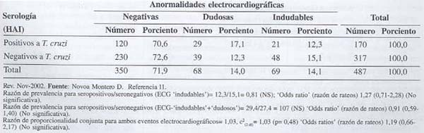 En el cuadro 2 se ve que las tasas ajustadas de prevalencia porciento de anormalidades electrocardiográficos 'indudables' fueron ligeramente menores entre los seropositivos (12,5%) que entre los seronegativos (14,9%) a T. cruzi,(9-11) (p=0,48) y que las tasas de prevalencia de anormalidades electrocardiográficas también fueron menores entre los seropositivos (14,6%) que entre los seronegativos (17,3%),(9-11) cuando para el análisis se excluyeron los resultados electrocardiográficamente 'dudosos' (p=0,50). Es decir que ninguno de los contrastes fue significativo, lo que reitera la inferencia de no asociación.