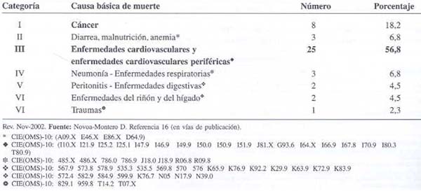 Cuadro 3. Distribución de frecuencia de las causas de muerte subyacente en 44 muertos entre 586 adultos rurales del estado Trujillo seguidos desde 1978-1982 hasta 1989