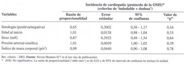 La incidencia de cardiomiopatía clínica definida con base en el Protocolo de Cardiomiopatías de la OMS,(20,21) no fue significativamente diferente entre chagásicos y no chagásicos,(18) lo que se mantuvo al ajustar los datos a través de la regresión logística (p=0,16), como se observa en el cuadro 4.(22)