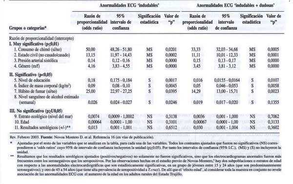 Cuadro 2. Tasas de prevalencia y razones de proporcionalidad ('odds ratios') para las anormalidades electrocardiográficas que sugieren cardiopatía con base en resultados serológicos, simultáneamente ajustadas por variables seleccionadas.*