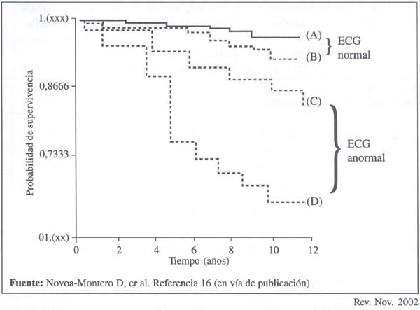(2) Que el grupo de adultos estudiados en Trujillo sobrevivieron en mayor proporción cuando habían presentado electrocardiogramas normales a su ingreso, sin que la condición de ser seropositivos a T. cruzi (infección chagásica crónica) fuera de peor pronóstico. Al contrario, la supervivencia de los seropositivos que presentaban electrocardiogramas anormales fue ligeramente superior que la de los seronegativos que ya tenían electrocardiogramas anormales al ingreso en el estudio(14,16) (figura 1).