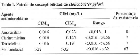 Se investigó la Concentración Inhibitoria Mínima (CIM), para los siguientes antibióticos: amoxicilina, claritromicina, tetraciclina y metronidazol, por el método de E-testTM; para ello 0,1 mL de una suspensión de la bacteria en caldo Brucella, equivalente a 3 Mc Farland se inoculó en placas de agar Mueller-Hinton adicionado de 5% de sangre humana. Se utilizó 1 tira del antibiótico por placa de 90 mm. Se incubaron a 37°C en atmósfera microaerofílica por 72 horas. Los criterios de resistencia usados fueron los siguientes: amoxicilina >2 mg/L; claritromicina >2 mg/L; tetraciclina >4 mg/L y metronidazol >8 mg/L.