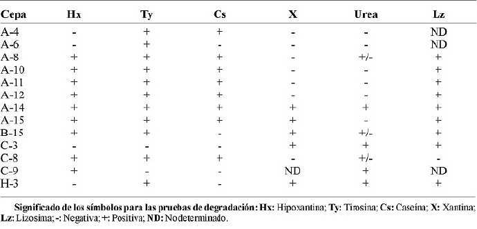 Para la identificación de las cepas aisladas se utilizaron distintos sustratos, tales como xantina, hipoxantina, caseína, tirosina, urea y lizosima, mismos que son degradados de forma característica por cada una de las especies pertenecientes al género Nocardia [9,5].