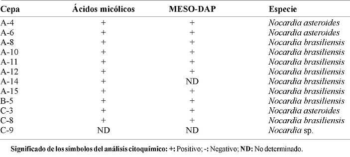 El cuadro 3 presenta la constitución química de la pared celular de las 13 cepas aisladas de Nocardia asteroides y Nocardia brasiliensis. Nocardia brasiliensis. En esta tabla se muestra la presencia positiva del ácido diaminopimélico (Meso-DAP) y los ácidos micólicos, los cuales son constituyentes propios de la pared tipo IV de las nocardias. Para efectos de estudio control se estudiaron cepas de referencia conocidas y se utilizó como control del Meso-DAP, comercial de la casa Sigma.