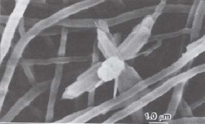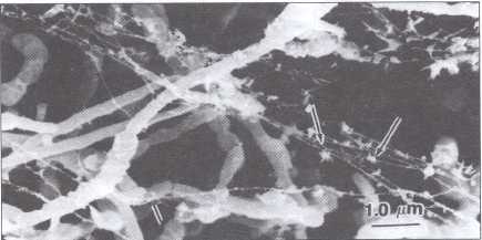 Figura 5: Cepa LRS4.74, vista al microscopio electrónico de barrido. Nótense las formaciones filamentosas finas, como cordones adornados con pequeñas formaciones cristalinas (flechas). 5.000 x.