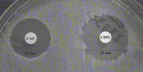 Figura 1. Prueba del disco combinado. Se puede observar que la diferencia de tamaño entre el disco de ceftazidima y el de ceftazidima/ácido clavulánico es mayor de 5 mm.