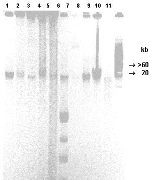Figura 2. Aislamiento de DNA plasmídico de las transconjugantes obtenidas en este trabajo. Carriles: 1: 9713; 2: 9728; 3: 9740; 4: 9751; 5: 9718; 6: 9782; 7: 9752; 8: 9758; 9: 9781; 10: 97127; 11: 97107.