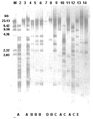En todas las transconjugantes se observó la presencia de un plásmido de alto peso molecular, el cual pudiera ser común y estar presente en los géneros identificados en las muestras analizadas. Para demostrar si se trata de un plásmido único, residente en los aislados nosocomiales sin distinción de género, se obtuvo y comparó el patrón de restricción (fingerprinting) del DNA plasmídico aislado a partir de cada una de las 28 cepas transconjugantes examinadas. Para el análisis de restricción se empleó la enzima PstI (Figura 3, Tabla 1). El 36% de las cepas demostró la presencia de patrones únicos, diferentes entre sí y no compartidos entre los aislamientos. Basándose en la similitud entre las bandas obtenidas, en el resto de las bacterias (64%) se pudieron diferenciar cinco patrones de restricción, identificados con las letras A, B, C, D y E (Figura 3, Tabla 1). El análisis de estos patrones reveló un predominio de los patrones A (20%) y B (17%) entre los plásmidos de las transconjugantes. El plásmido de alto peso molecular que generó el patrón de restricción B, se encontró en cuatro de los géneros identificados en los diversos servicios del Hospital: Enterobacter, Pseudomonas, Escherichia y Klebsiella (Tabla 1), mientras que el plásmido que generó el patrón A se encontró en los géneros Klebsiella y Escherichia.