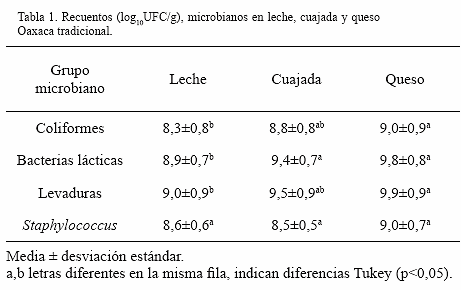 Conteos microbianos: Los recuentos microbianos analizados en leche, cuajada y queso se muestran en la tabla 1. El análisis de varianza (ANOVA) mostró diferencias significativas (p<0.05) para leche y queso con respecto al número de bacterias coliformes totales, BAL y levaduras; Staphylococcus spp. no presentó diferencia entre las fases analizadas.