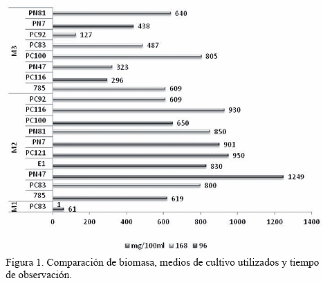 Selección de medios de cultivo para el proceso de fermentación: Se seleccionaron las cepas de Nocardia y Rhodococcus (22 cepas) y según los patrones de crecimiento se observó que la mayor producción de metabolitos bioactivos se presentó en 15 cepas clínicas (67%) y del suelo sólo en 7 (33%), siendo estas cepas las que presentaron la mejor actividad antifúngica y/o antibacteriana. El medio de fermentación M2 presentó el mayor rendimiento tanto en la producción de metabolitos secundarios como de biomasa. El medio YMD (M3) favoreció sólo la producción de biomasa y en el medio Bennett (M1) no se observó producción de metabolitos bioactivos ni de biomasa por parte de las cepas (Figura 1).