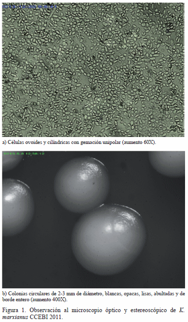 Los resultados obtenidos mostraron que el cultivo de K. marxianus CCEBI 2011 se mantuvo con una elevada pureza en los métodos de conservación empleados, no observándose contaminantes. La observación al microscopio óptico mostró células ovoides y cilíndricas con gemación unipolar (Figura 1a) y al microscopio estereoscópico colonias circulares de 2-3 mm de diámetro, blancas, opacas, lisas, abultadas y de borde entero (Figura 1b), características identificadas inicialmente al depositar la cepa en el año 2002 para su conservación.