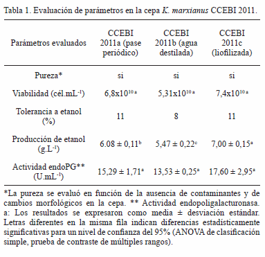 En la tabla 1 se muestran los valores de viabilidad de la cepa K. marxianus CCEBI 2011 conservada bajo los diferentes métodos. La comparación de las medias de los valores de viabilidad de las cepas estudiadas por los métodos utilizados, con respecto a la cepa conservada por liofilización, no arrojó diferencias estadísticamente significativas (p=0,3401).