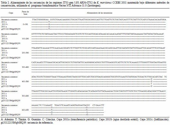 La comparación de la secuencia de la cepa CCEBI 2011a (transferencia periódica) con secuencias disponibles en el Genbank arrojó un 99% de homología con cepas de K. marxianus depositadas en este sitio, entre ellas K. marxianus CHY1612 secuencia gi|311221586|gb|HQ39 y K. marxianus WM 39 secuencia gi|148535531|gb|EF56, entre otras, con una identidad en 646 de 650 pb analizados. Esta pequeña diferencia, en cuanto a los pares de bases secuenciados, pudo deberse a la inestabilidad de la cepa relacionada con el método de conservación.
