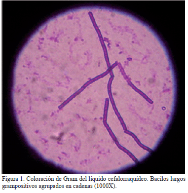 Los resultados de laboratorio se muestran en la tabla 1. Las muestras de sangre para hemocultivos fueron monitoreadas mediante Bactec 9120 ((Becton Dickinson and Company, Maryland, USA), obteniéndose crecimiento a las 24 h de incubación. El cultivo del LCR se procesó según los métodos convencionales [9]. En la coloración de Gram se observaron 1-2 leucocitos/campo de 1000X y bacilos largos grampositivos agrupados en cadenas (Figura 1). En todas las muestras se obtuvo desarrollo de colonias grandes, opacas, sin pigmento y de bordes irregulares; la coloración de Gram reveló bacilos grampositivos esporulados, que fueron identificados mediante el método automatizado BD PhoenixTM System (Becton Dickinson and Company, Maryland, USA) como B. thuringiensis. Se realizaron pruebas bioquímicas adicionales para confirmar esta identificación como producción de catalasa y la arginina decarboxilasa (positivas) y motilidad (negativa).