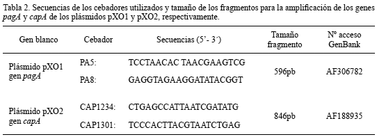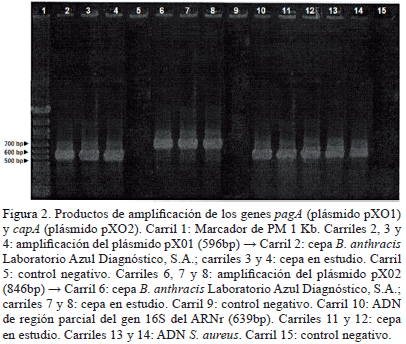 La extracción de ADN genómico se realizó por ebullición durante 10 minutos a 100 ºC, a partir de una suspensión al 0,5 Mc Farland de un cultivo de 24 h del aislado en buffer Tris, que posteriormente se centrifugó a 10.000 g durante 10 minutos para eliminar restos celulares. El sobrenadante fue trasvasado a un tubo nuevo y almacenado a -20 °C hasta su utilización en la reacción de amplificación. Se realizó la técnica de reacción en cadena de la polimerasa (PCR, por sus siglas en inglés) para amplificar el gen pagA, que codifica al antígeno protector en el plásmido pXO1 y el gen capA del operón cap, que codifica la biosíntesis de la cápsula en el plásmido pXO2 (Tabla 2). Se incluyó un control negativo, donde el templado de ADN se reemplazó por agua y como control positivo se utilizó una cepa de B. antrhacis obtenida de cultivos puros de aislamientos procedentes de animales, perteneciente al Laboratorio Azul Diagnóstico, S.A. Para el control de ADN se amplificó una región parcial del gen 16S del ARN ribosomal de la cepa control de B. anthracis (tamaño del fragmento esperado: 639 bp) y el ADN de una cepa de Staphylococcus aureus. El ADN del aislado de la muestra clínica se procesó por duplicado. Los oligonucleótidos y el protocolo de PCR usados fueron los recomendados por la Oficina Internacional de Epizootias (OIE) [7,10,11].