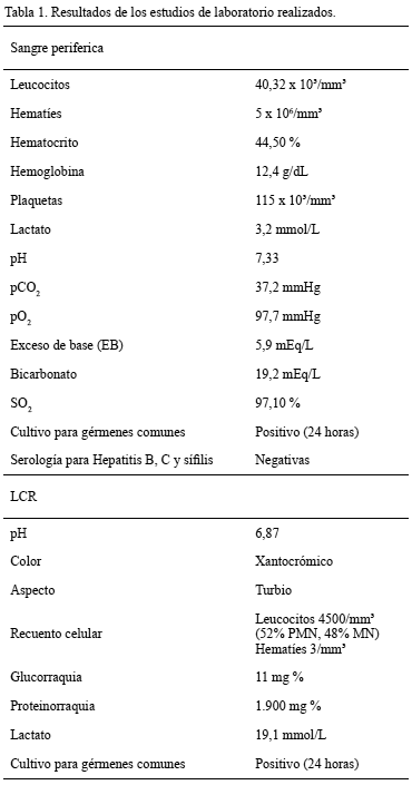 A los dos días de tratamiento, ingresó al servicio de guardias y urgencias del Hospital Dr. José M. Cullen de la ciudad de Santa Fe en estado de coma, con depresión del sistema nervioso central. Se constató traumatismo toracoabdominal derecho, como consecuencia de una caída de su propia altura, y una pequeña laceración en un dedo. Fue trasladado de inmediato al servicio de terapia intensiva sin respuesta ocular ni verbal pero con respuesta motora reactiva, vía aérea limpia, hemodinámicamente estable y abdomen blando en hipocondrio derecho (Glasgow 6/15). Se ordena asistencia respiratoria mecánica y estudios complementarios de laboratorio y de diagnóstico por imágenes. Se indicó tratamiento empírico con meropenem (2 gr/día) y vancomicina (1 gr/día). La radiografía de tórax mostró derrame pleural derecho y la tomografía axial computarizada (TAC) abdominal reveló líquido libre perihepático. La TAC de cráneo mostró una masa bien definida en el lóbulo occipital izquierdo.